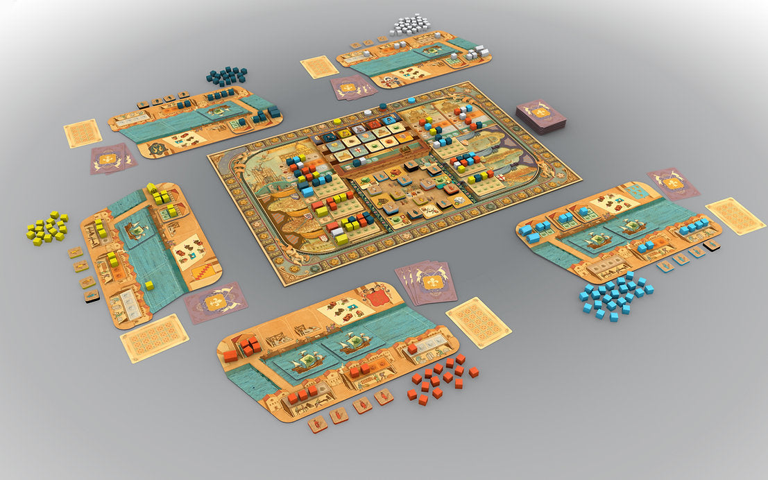 Players of Calimala are cloth merchants in medieval Florence, with a number of trusted employees that they assign to various streets within the city to carry out actions. (Each street connects two places where particular actions can be taken.) While taking these actions, players produce and deliver cloth and contribute to the construction and decoration of various buildings across the city. Employees stay on their assigned places for a while, carrying out their actions whenever the street is activated, and eventually are promoted into the city council, triggering a scoring phase.